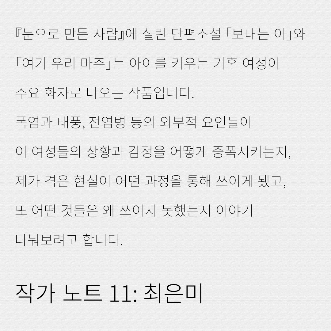 『눈으로 만든 사람』에 실린 단편소설 「보내는 이」와 「여기 우리 마주」는 아이를 키우는 기혼 여성이 주요 화자로 나오는 작품입니다. 폭염과 태풍, 전염병 등의 외부 요인들이 이 여성들의 상황과 감정을 어떻게 증폭시키는지, 제가 겪은 현실이 어떤 과정을 통해 쓰이게 됐는지, 또 어떤 것들은 왜 쓰이지 못했는지 이야기 나눠보려고 합니다.