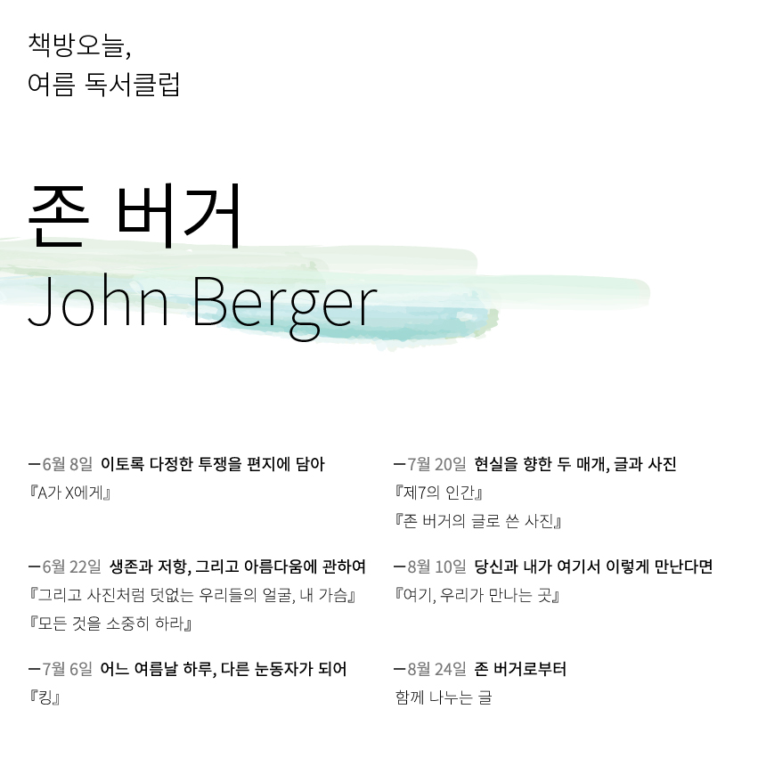 6월부터 여름 독서클럽 '존 버거'를 진행합니다. 아래는 독서클럽을 진행하는 최리의 작가의 소개글입니다. 여름에도 책방과 함께해요.
