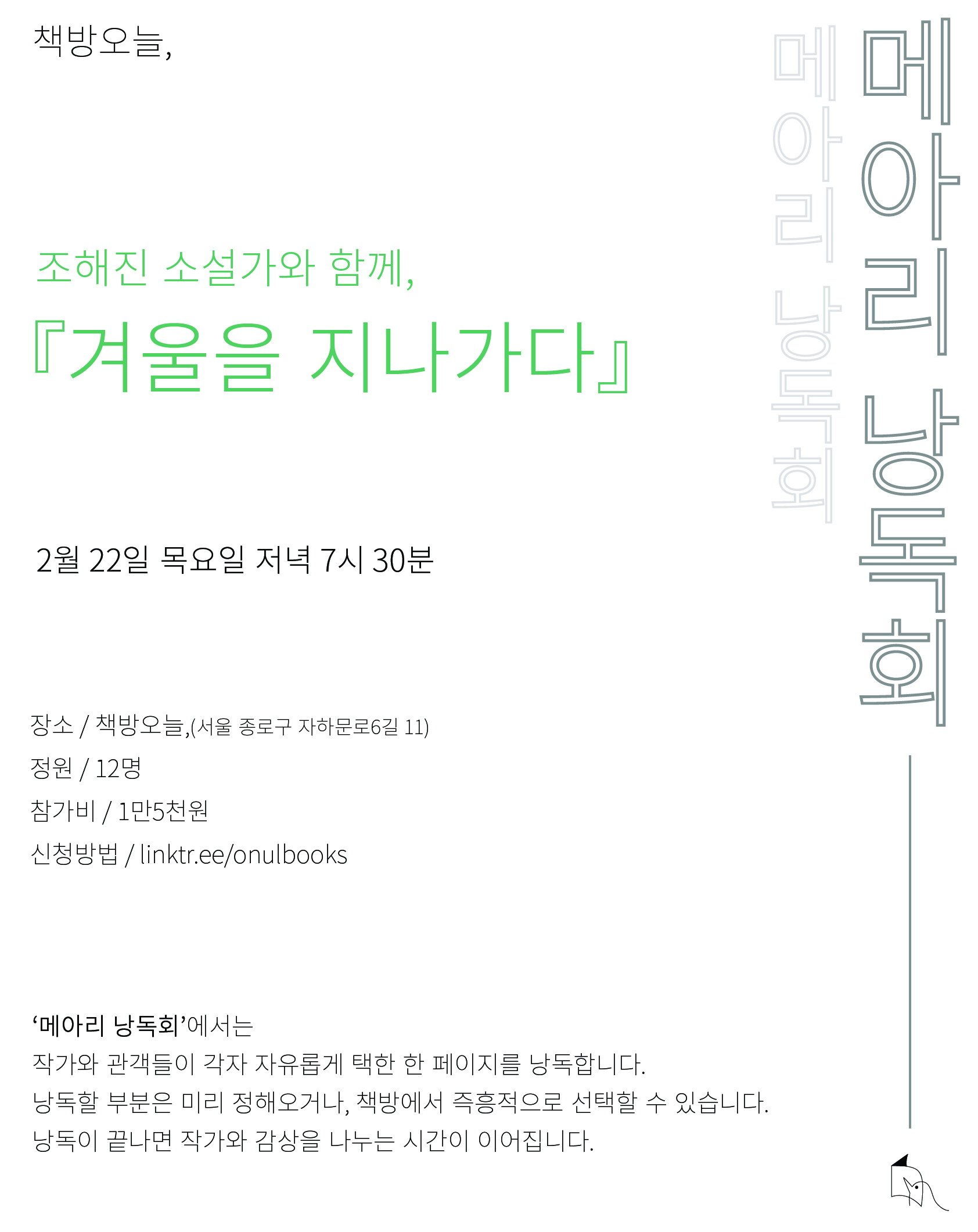 책방오늘, 메아리 낭독회 시간에 초대합니다.2월 22일(목) 저녁 7:30, 『겨울을 지나가다』를 조해진 소설가와 함께 읽고 이야기 나누는 시간입니다.'메아리 낭독회'에서는 작가와 관객들이 각자 자유롭게 택한 한 페이지를 낭독합니다. 낭독할 부분은 미리 정해오거나, 책방에서 즉흥적으로 선택할 수 있습니다. 낭독이 끝나면 작가와 감상을 나누는 시간이 이어집니다.『겨울을 지나가다』와 함께하실 분들을 기다립니다.-일시: 2월 22일 목요일 저녁 7시 30분